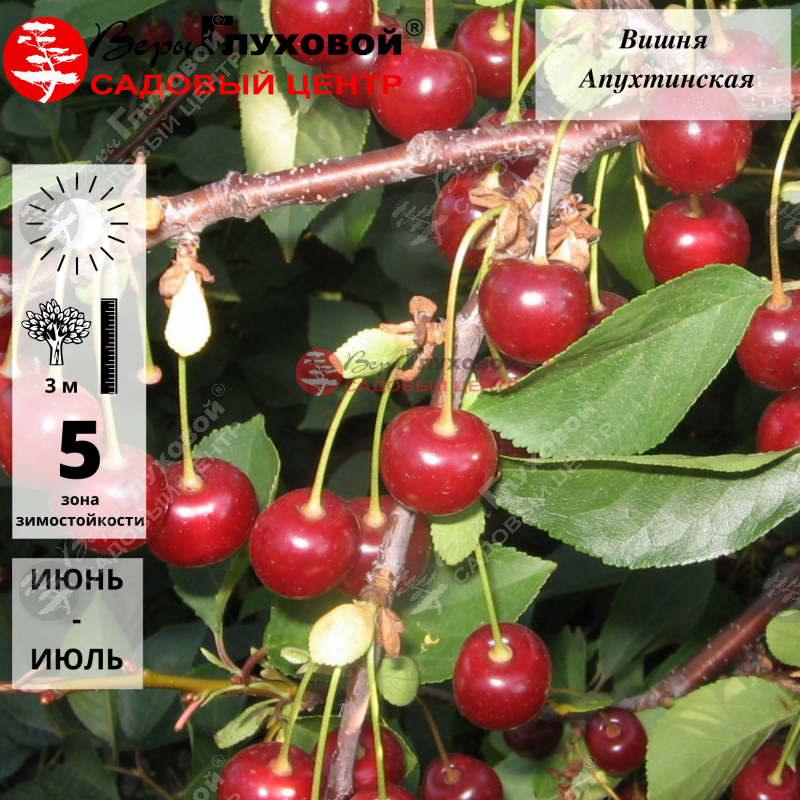 Дерево этого сорта вишни относят к среднерослым, высотой до 3 м. По внешнему виду похоже на куст, ствол короткий, скелетные ветки хорошо развиты. Крона не загущена, пониклая с разлогими ветками средней толщины. Требует регулярной обрезки. Ветви покрыты небольшими (до 6 см в длину) листьями темно-зеленого цвета. Цветет дерево в первой декаде июня белоснежными пятилепестковыми цветами. В связи с поздним цветением завязи редко обмерзают. В стадию плодоношения вишня сорта Апухтинская вступает на второй год после посадки. Плоды начинают созревать в августе. Вызревание постепенное, но вишни не осыпаются, и весь урожай можно собрать за один заход. С одного дерева при качественном уходе можно собрать более 20 кг вишни.